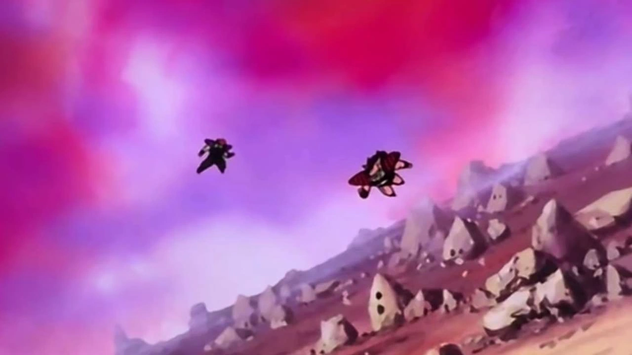 El plano cambia a la atmósfera del planeta kabocha, saliendo de ella una pequeña nave con el símbolo de los piratas espaciales.