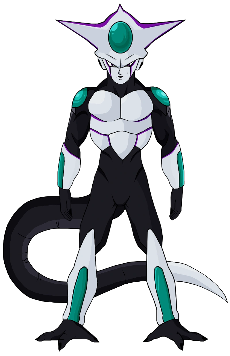 Cuando está rejuvenecido, mide 175 centímetros. Sus dientes son blancos y están afilados. Su piel es negra, y parece estar cubierta en ciertas zonas por algo parecido a una armadura de color blanco. Estas cubren sus muñecas, sus tobillos, su pecho y hombros, y la punta de su cola. En la cabeza parece tener un casco, teniendo toda su cara blanca y con dos rayas moradas. Sus ojos son negros, con la iris amarilla. En sus hombros y en su cabeza tiene dos rayos morados, que al parecer brillan cuando se encuentran en un ambiente oscuro. En sus hombros y en su cabeza tiene cristales de color turquesa.