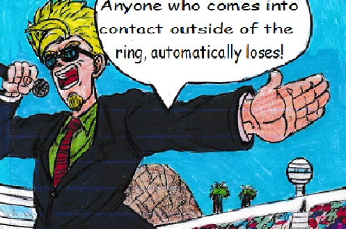 Pooh charges with a punch, but Chalot manages to avoid it. Pooh launches another punch, but Chalot blocks it and Pooh launch a mouth beam cannon at close range knocking Chalot onto his his back in the ring. Chalot regains balance and gets up and charge with a double back kick to pooh's stomach causing him to yell in agony and pain from the attack.
