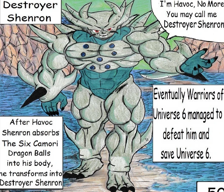 In Age 791, Black Smoke Flute was formed from the corrupted Camori Dragon Balls. The Evil Dragon splits into seven Shadow Dragon. After six of the Shadow Dragons are defeated, only one Shadow Dragon remains. Havoc Shenron is confronted. After Havoc Shenorn managed to absorb the six Camori Dragon Balss into his body, he transforms into a Super Shadow Dragon Called himself Rampage Shenron. Warriors of Universe 6 joined together to defeat the Evil Shadow Dragon.