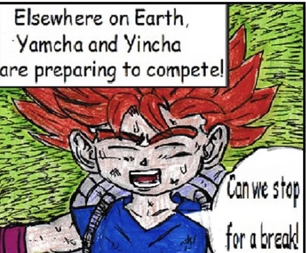 Later on Papaya Island, Kuri is seen registering for the Junior Division of the 32nd Tenkaichi Budokai. Krillin registers for the Adult Division. Yamcha and his son, Yincha enters the tours and t along with Tien Shinhan. Yamcha is pumped to fight, but oolong reminds him of his previous bad luck in past tournaments and Puar scolds oolong. Aya and Yincha are confused about what Oolong is talking about.