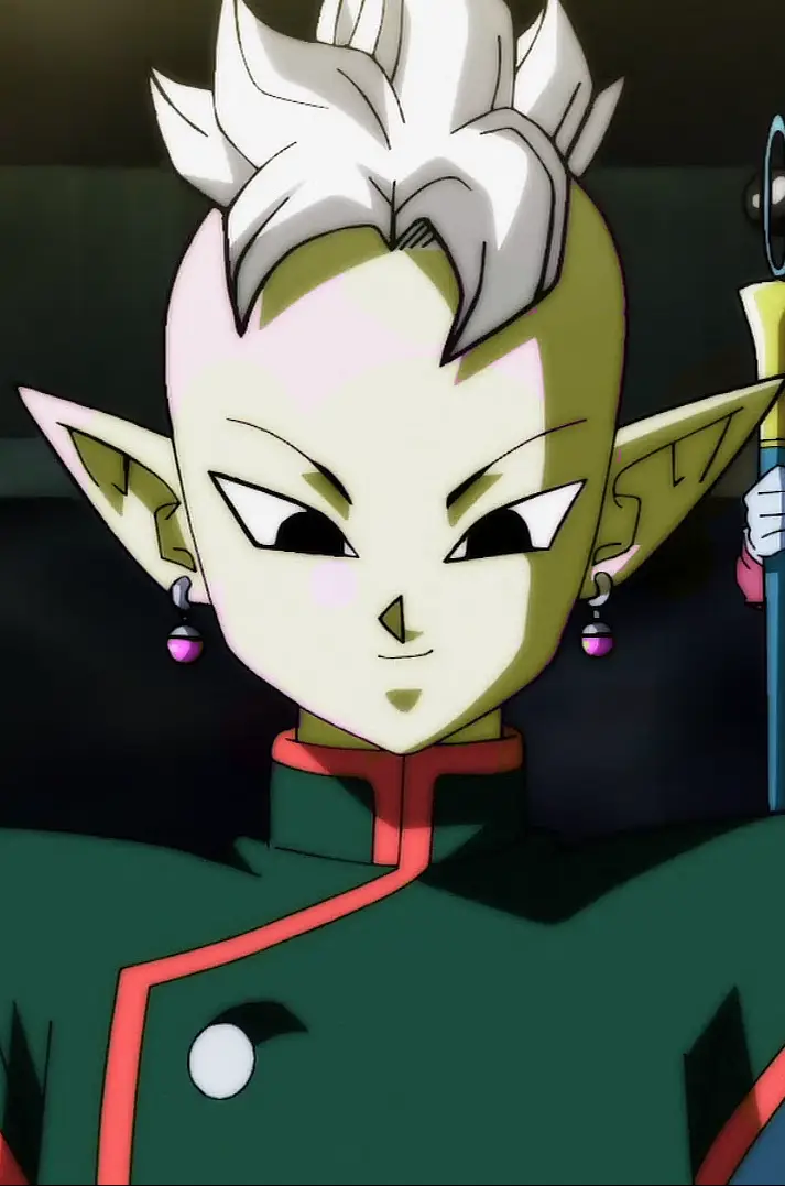 Shin is short, swa,py lime-skinned with a white mohawk and dressed in a dark green coat with red lining, an orange waist cloak, a pale teal long-sleeved shirt with matching pants and red boots. He also wears a pair of purple Potara earrings (violet in the anime).