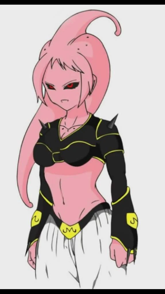When in her pure majin forms he grows a body armour-like suit that is stuck to her and acts as a shield, this suit has multiple spikes on it and is very powerful. On her lower body is shorts that have an ¨M¨ emblem/symbol on it representing the Majin species/a i.e demon, evil spirit, and devil etc.