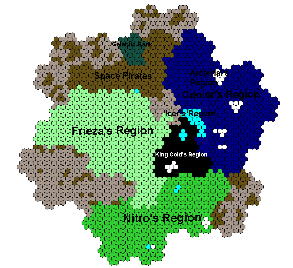Cooler's Empire is the territory of the Planet Trade Organization which is overseen by Cooler. During the imperial maximum (before Frieza and King Cold's deaths), his was the largest territory in the Planet Trade Organization. When it fractured upon Cooler's death, the territory was split between Kuriza's Empire, Arcterial's Empire, and Icer's Empire, with the majority of Cooler's worlds eventually coming under control of Icer following the Pax Arcosia.