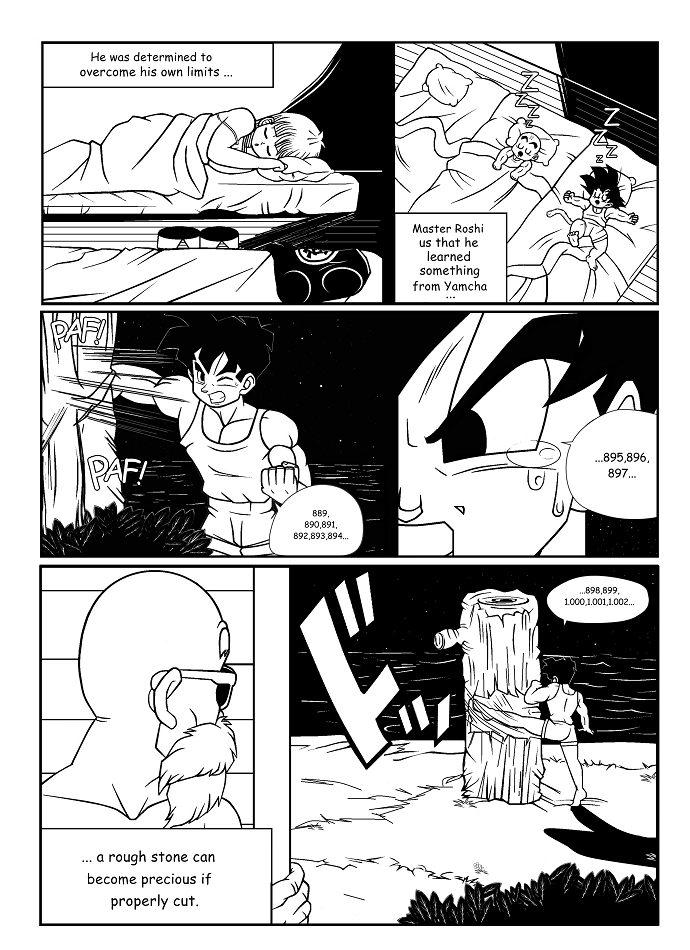 Also a disciple of Roshi, Krillin is one of Yamcha and Goku's best friends. He migrated to Roshi Island to become stronger with the training of the great master.
