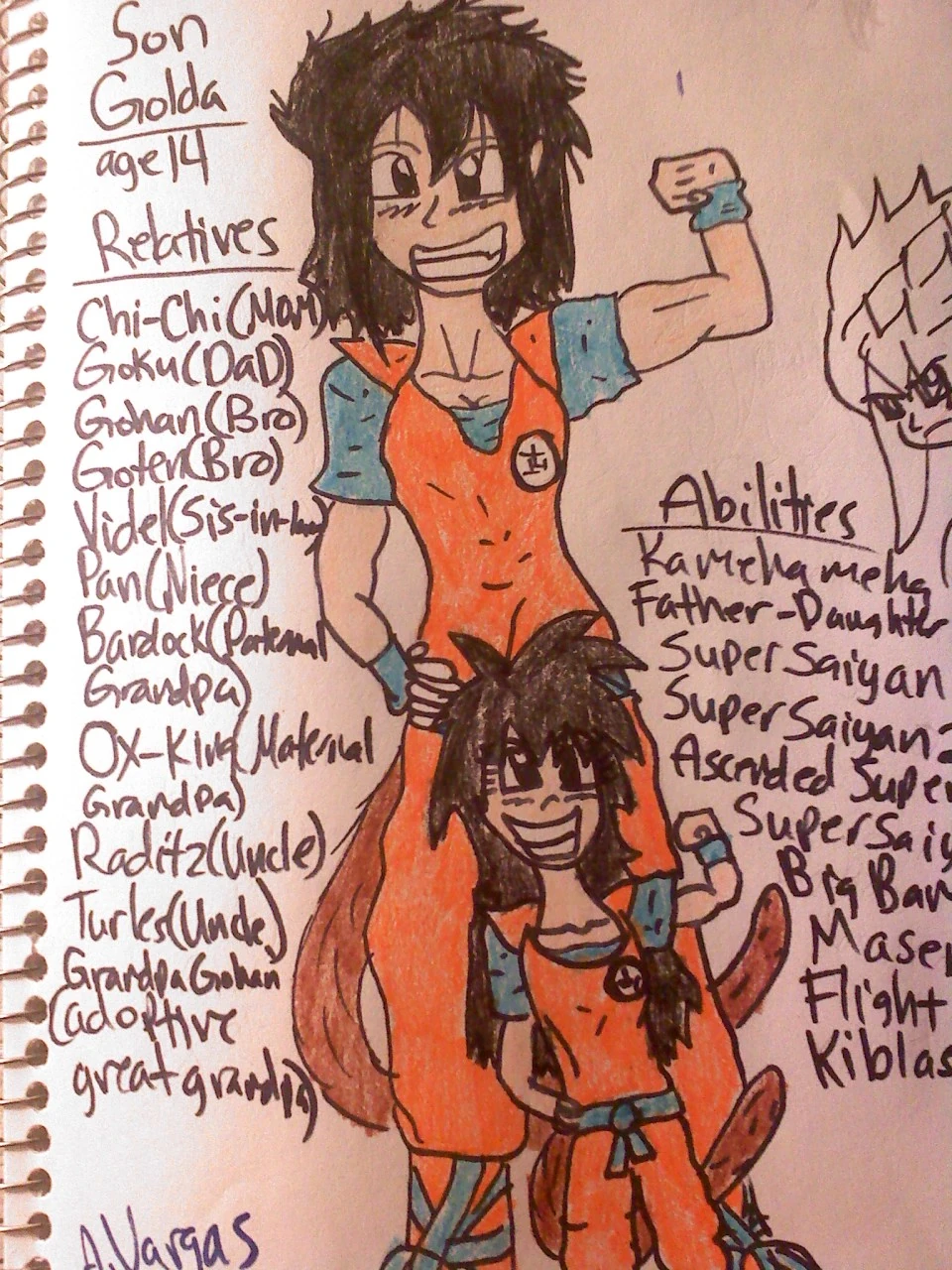 As a child, Golda was very näive, and was a magnet for danger. Falling off of cliffs, being chased by dinosaurs, being hit by a car, all these happened with a smile on her face. The danger always excited her, and she would giggle at her family's surprise. When she turned thirteen, Chi-Chi finally allowed Golda to train with Goku and Gohan, even though she disapproved. Golda's one condition was to take care of Chi-Chi and Goku when they got older, while Chi-Chi sighed and said, "I doubt your Daddy will get old though." During the events of DragonBallZ:The Resurrection, Golda's fears come true. Even though she was not afraid of dying, just like Goku, she did fear her family's deaths and being alone in the world.