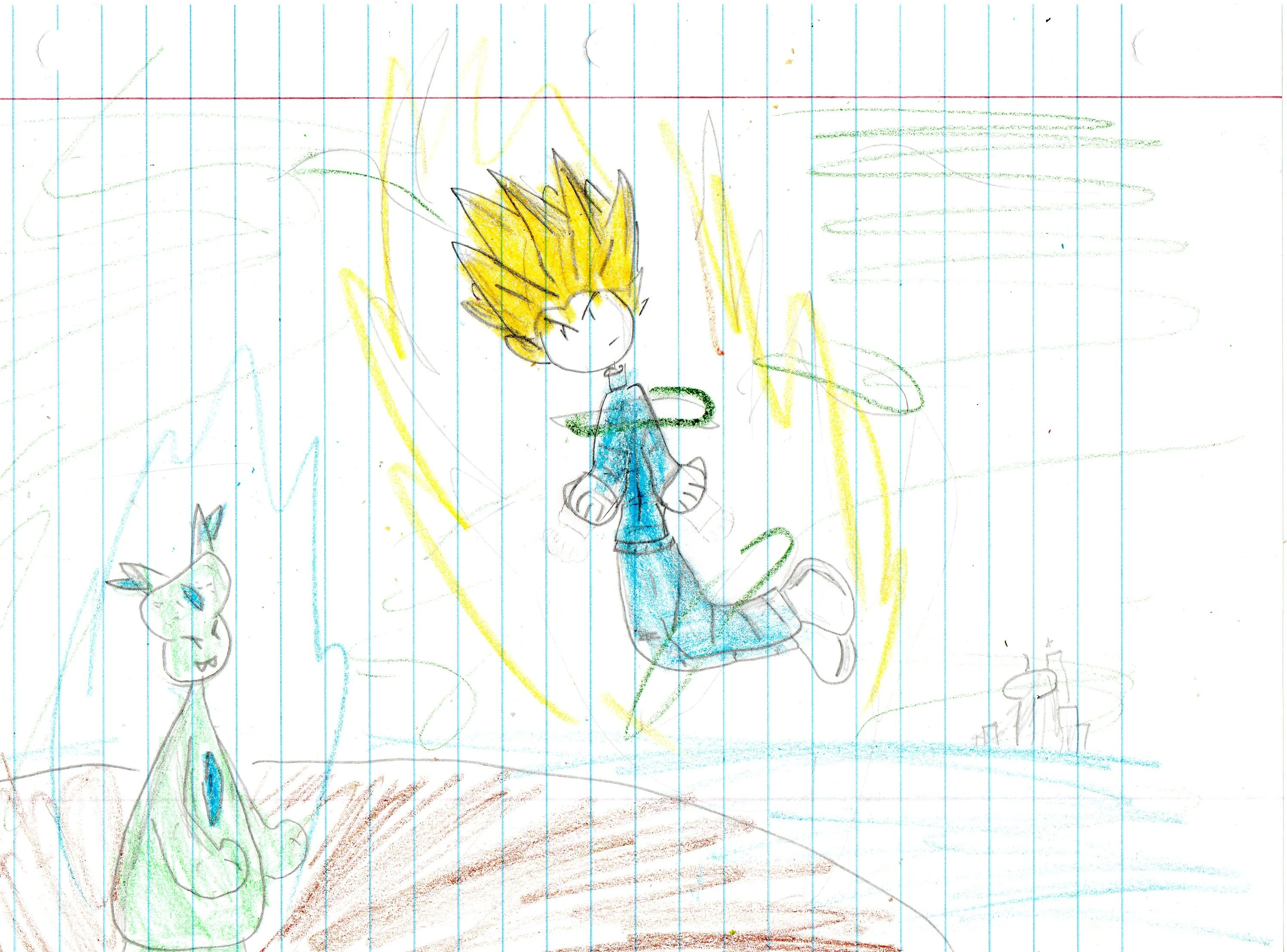 Kuzon: As I was saying, I grew up on a planet not far from here. I'll tell you all it. Just before Planet Vegeta blew up, my parents, escaped luckily. Due to randomly pressing buttons to get off the planet, my parent's landed on a unamed planet. They stayed there and was going to destroy it, but forgot about Frieza... I mean, what would they do then? And they was amazed at the planet's race's, hospitality. Anyway, they lived there because their spaceship broke and couldn't go anywhere. 7 years later, I was born to them. They named me Kuzon, I don't know why. My father trained me until we met a little Greenie one day, Mumba, then we had some up's and down's and We became friends and my father trained both of us. Me and Mumba grew up together and became best friends. Though, one night, when I was 7, I was in bed. Then, I suddenly saw a picture in my mind of a Saiyan. I didn't know who though, but that night, I be came Legendary.