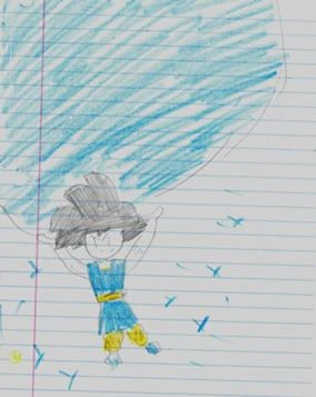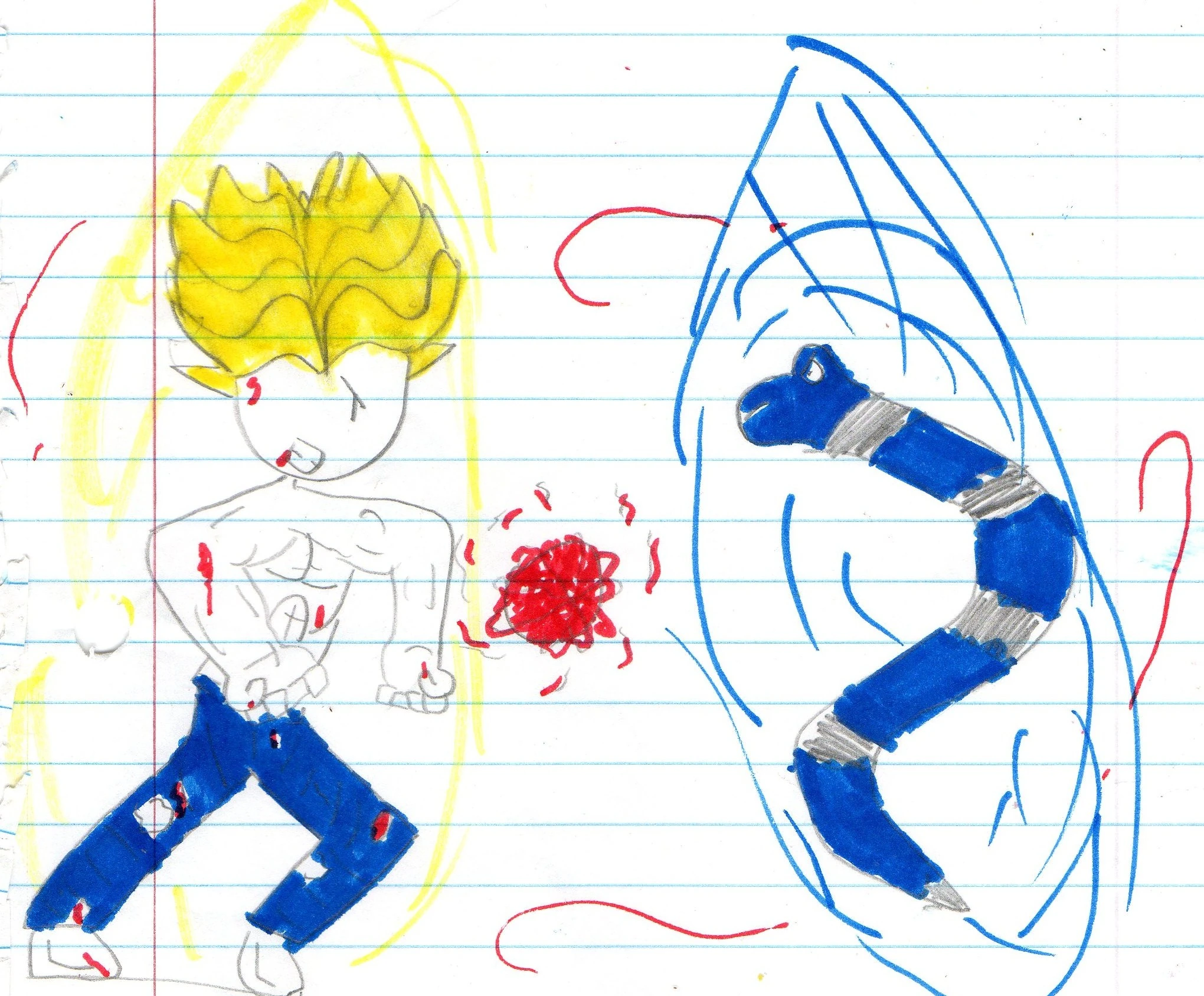 King Meje takes on the blast from the ground..Kuzon puts his full Super Saiyan 3 power in the blast! The blast starts making the ground crumble apart. The sky fades a dark..black, and lightning strikes everywhere.. The blast grows the thickness of a school bus, and is a thick blue and green, with blue slips going through it..