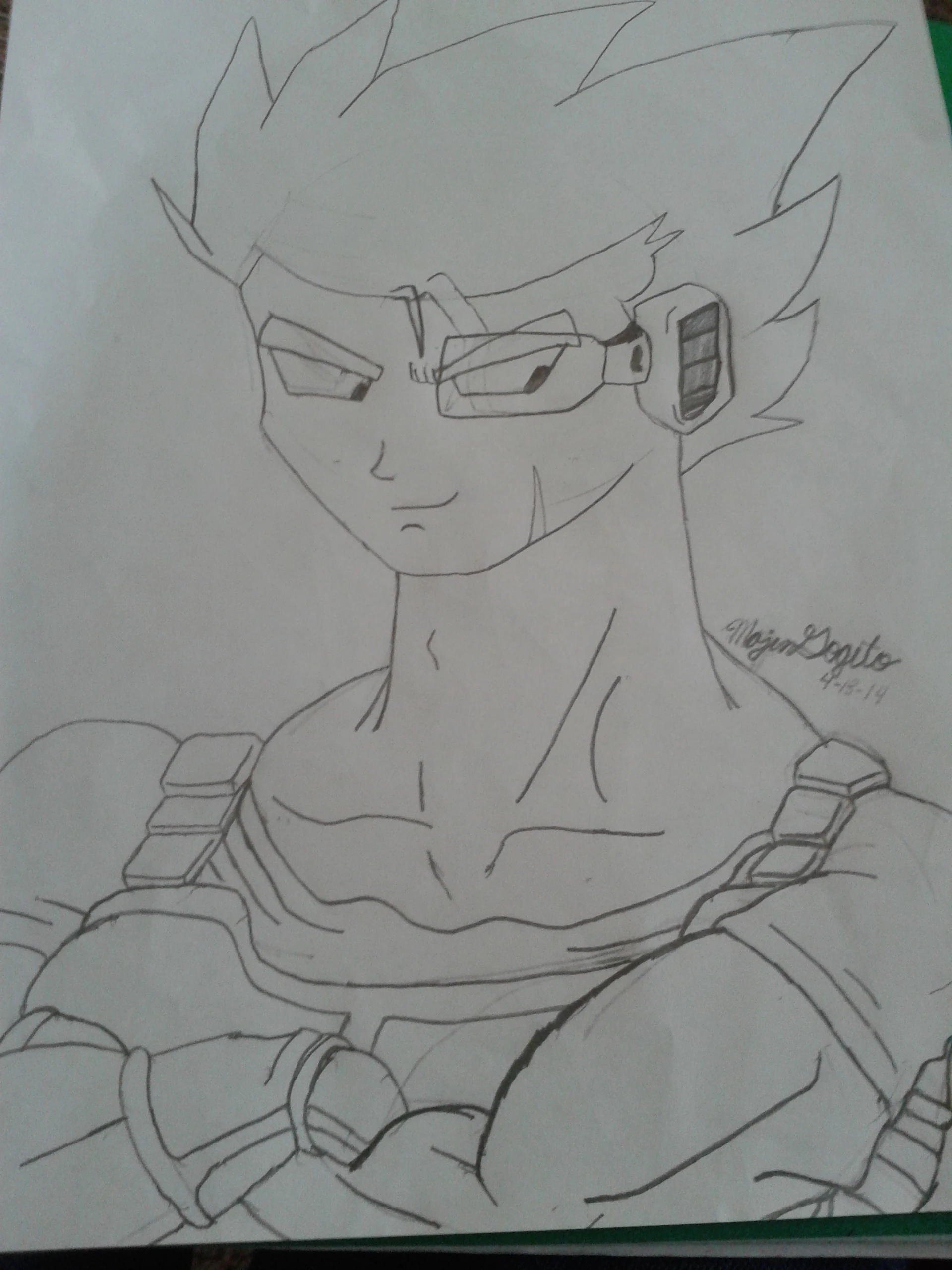 The armor that Tharos mostly wears throughout the entire story is given to him by a soldier in the second chapter. It is a blue-black color and has light-brown colored sharps (instead of pauldrons). Its chest pieces, stomach pieces, and harnasses are also a light-brown color. He usually wears a grey, sleeveless jumpsuit under it and blue-black gloves and boots along with it. His scouter is a dark crimson red color.