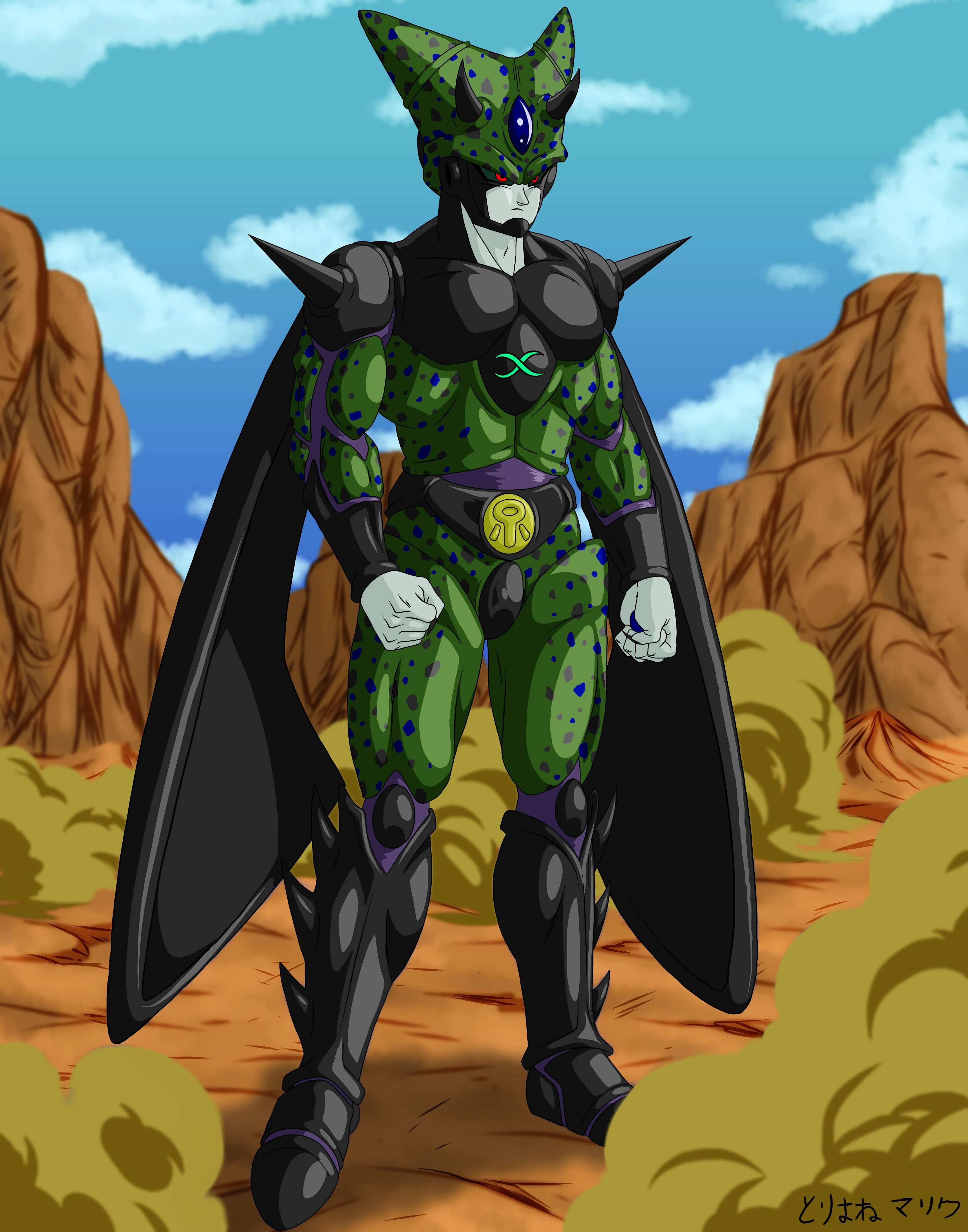 X (エックス Ekkusu) is a Bio-Android created by Towa. He is the primary antagonist of the Cell-X Saga and X Saga, and final antagonist of Cell-X Saga group overall. He was created using cells of several different individuals giving him the cells of several Majins, Devils, Frieza Race, Saiyans, Glinds, Buu's subspecies, Namekians, and Earthlings.